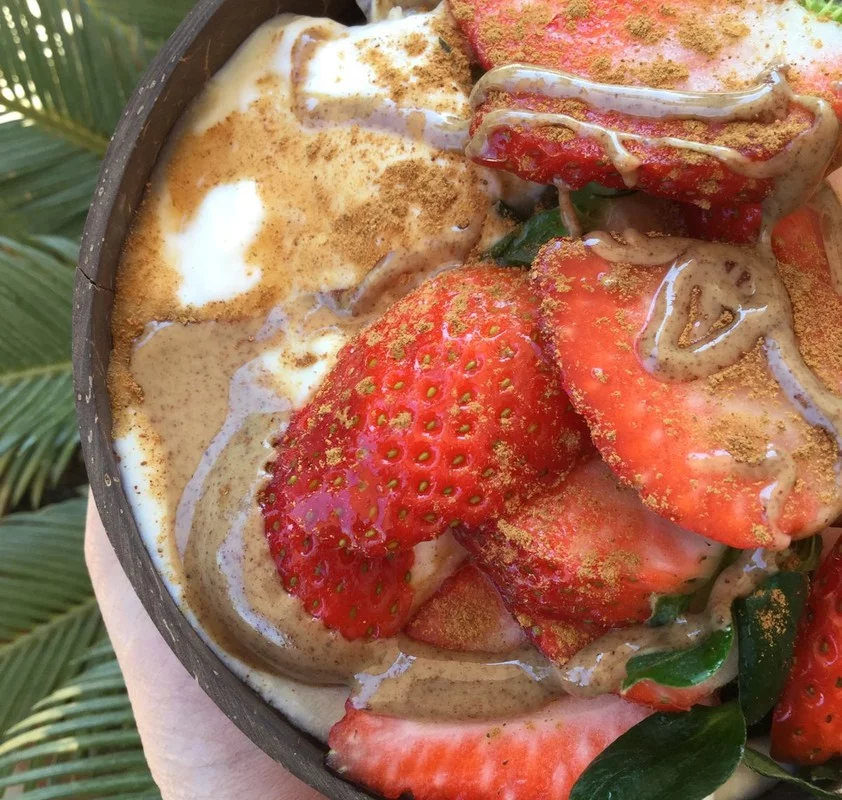 Chop the strawberries and top oatmeal first with soy yogurt, then berries, almond butter, maple syrup, and finish of with cinnamon.